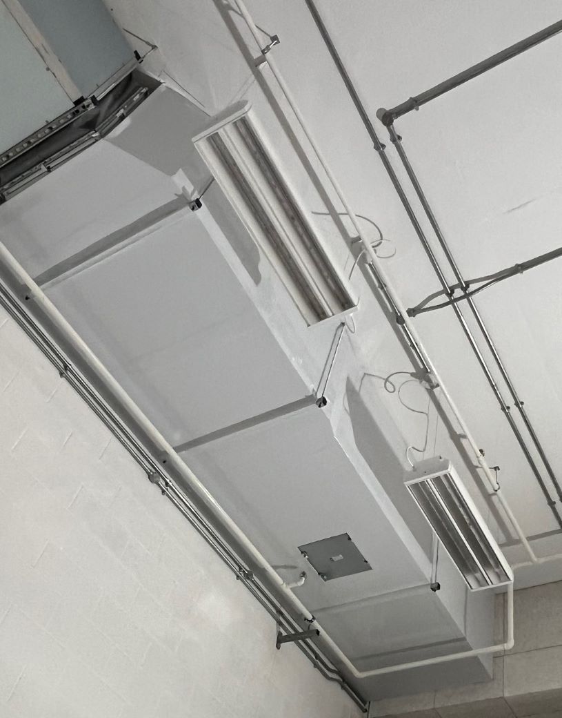 A 6m wide expanse of ductwork insulated with phenolic slab and finished with white laminate sheet cladding.