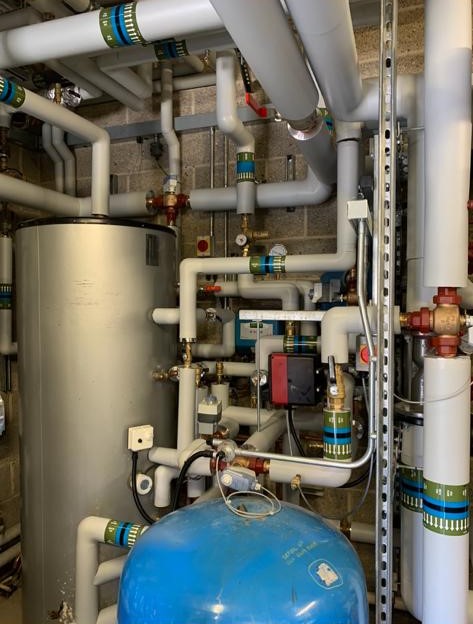 Pipework within an internal plant room – insulated with phenolic section and finished in Isogenopak sheeting.